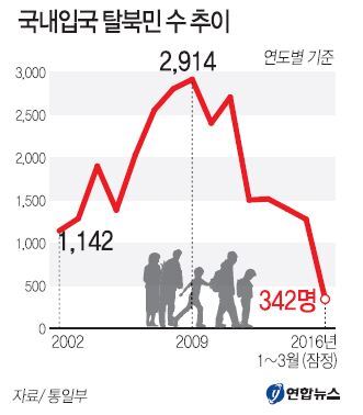 2009년 2914명까지 늘었던 국내 입국 탈북민 수는 김정은 국방위원회 제1위원장이 국경단속 및 감시를 강화하면서 2011년 2706명, 2012년 1502명, 2013년 1514명, 2015년 1397명, 2015년 1276명으로 감소해 왔다.