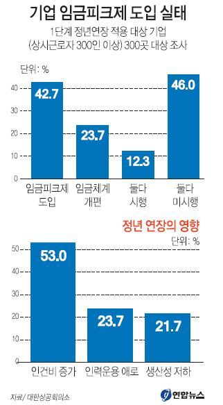 대한상공회의소는 1단계 정년연장 적용 대상 기업(상시근로자 300인 이상) 300곳을 대상으로 조사한 결과 임금피크제를 도입한 기업은 42.7%로 나타났다고 21일 밝혔다.