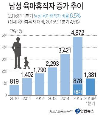 지역별로 보면 남성 육아휴직자는 서울·경기·인천 등 수도권에 68.9%가 집중됐다. 증가율은 전북(121.4%), 서울(94.6%), 경남(80.6%) 순으로 높았다. 산업별로는 제조업, 출판·방송통신·정보서비스업, 도·소매업 종사자가 많았다. 증가율은 건설업(262.2%), 교육서비스업(90.9%), 숙박·음식점업(76.2%) 등이 높았다. 연합뉴스