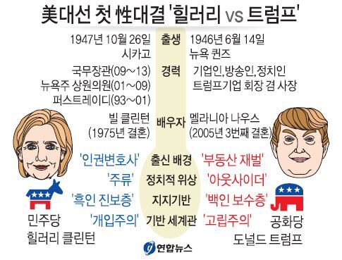 미국 민주당 힐러리 클린턴 전 국무장관과 공화당 도널드 트럼프가 오는 11월 대선 본선에서 맞붙는다. 트럼프가 3일(현지시간) 중동부 인디애나 주 경선에서 큰 승리를 거두며 일주일전 5개 주 경선의 대승으로 민주당 대선후보로 자리매김한 클린턴 전 장관에 이어 사실상 당 대선후보의 지위에 올랐기 때문이다. 7월 각 당의 전당대회를 거쳐 향후 본격화할 두 후보 간 백악관행 맞대결은 ‘여성과 남성’, ‘워싱턴 주류와 아웃사이더’, ‘첫 부부 대통령 도전과 부동산 재벌 출신 첫 대통령 도전’, ‘대권 재수 후보 간 대결’이라는 진기록을 써나가는 세기의 승부가 될 전망이다. 연합뉴스