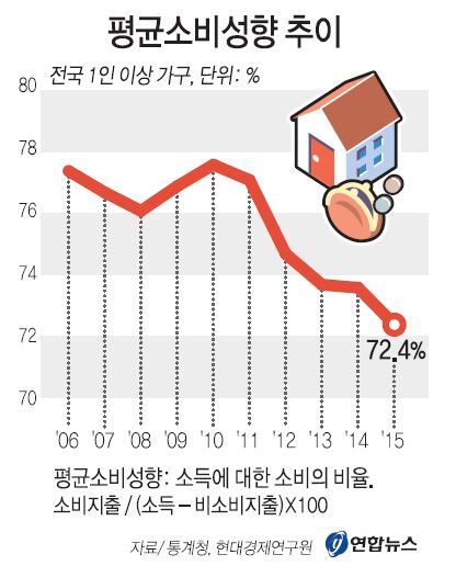 평균소비성향은 2006~2011년까지만 해도 77% 전후를 유지했지만 2012년부터 급감하기 시작했다. 2011년(77.1%)과 비교해 4년 사이에 4.7%포인트 감소한 것이다.