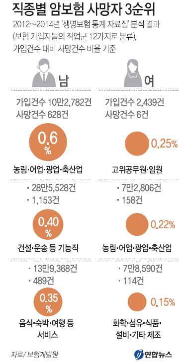 보험개발원은 보험 가입자들의 직업군을 12가지로 분류해 보유한 보험계약과 사망건수 등을 조사했다. 연합뉴스