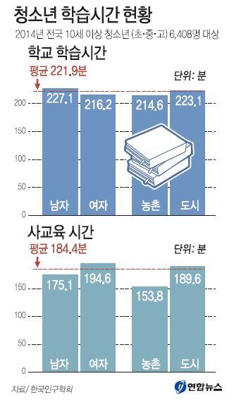 이에 따르면 2014년 기준으로 초중고 재학생의 총 학습시간은 하루 평균 406분(6시간46분)으로 나타났다.