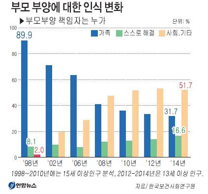 24일 한국보건사회연구원의 ‘부양환경 변화에 따른 가족부양특성과 정책과제’(김유경 보사연 연구위원) 보고서에 따르면 ‘부모부양의 책임자’가 가족이라는 인식은 1998년 조사대상의 89.9%로 대부분을 차지했지만 2014년에는 31.7%로 크게 줄었다. 통계청의 사회조사결과를 통해 분석한 결과다.