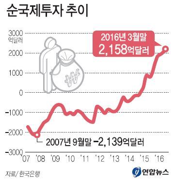 우리나라의 순국제투자는 작년 말(1953억달러)보다 206억 달러 증가하면서 사상 처음 2000억 달러를 돌파했다. 순국제투자는 분기 기준으로 2014년 9월 말 처음 플러스를 기록했고 우리나라는금융자산이 금융부채를 초과하는 순자산국 지위를 7분기째 이어갔다. 연합뉴스