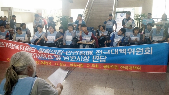 전국의 18개 시민·사회·노동·장애인단체로 구성된 ‘한기장복지재단 평화의집 인권침해 전국대책위원회(이하 평화의집 전국대책위)’ 관계자 50여명은 25일 남원시청 로비에서 기자회견을 열고 “평화의집 사태의 관리감독 책임이 있는 남원시는 즉각 사과하라”고 촉구했다.