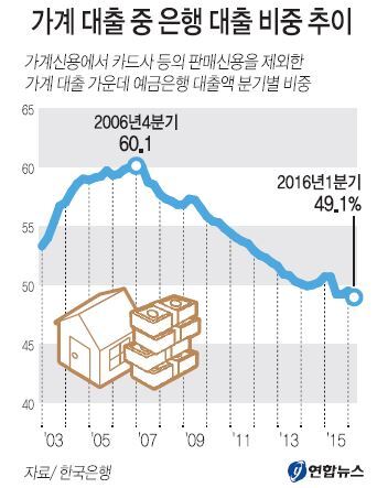 가계가 금융회사에서 빌린 돈 가운데 은행 대출의 비중이 50%를 밑돌고 있다.