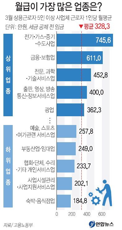 상용직 1인당 월평균 임금총액은 347만 3000원으로 3.6% 올랐다. 임시·일용직은141만 3000원으로 2.1% 증가했다. 월평균 임금총액이 많은 산업은 전기·가스·증기·수도사업(745만 6000원), 금융·보험업(611만원) 등이었다. 임금총액이 낮은 산업은 숙박·음식점업(184만 8000원)과 청소, 경비 등이 포함된 사업시설관리·사업지원서비스업(202만 1000원) 등이었다. 연합뉴스