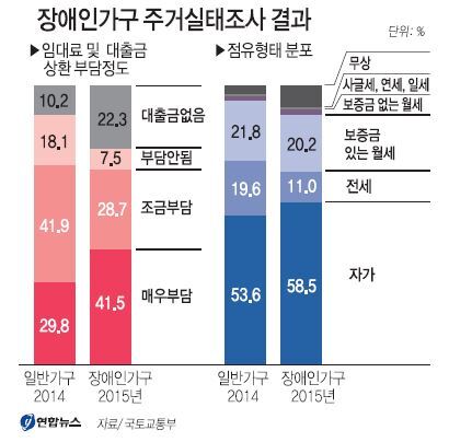 2일 국토교통부가 국토연구원에 맡겨 시행한 ‘2015년도 장애인가구 주거실태조사’ 결과를 보면 장애인가구의 41.5%는 주택임차료를 내거나 대출금을 갚기 ’매우 부담된다 ‘고 밝혔고 28.7%는 ’조금 부담된다 ‘고 답했다. 연합뉴스