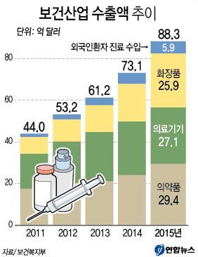 12일 보건복지부의 ‘2015년 보건산업 수출현황’ 자료를 보면 작년 의약품, 의료기기, 화장품, 외국인환자 진료수입 등 보건산업의 수출액은 88억3000만 달러(약 10조2000억원)로 전년대비 21% 증가했다.