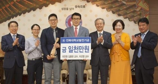 전북대는 의학전문대학원 김종헌(흉부외과)·이선영 교수(방사선종양학과)가 최근 대학발전기금 1000만원을 기탁했다고 13일 밝혔다. 이남호 총장은 김종헌·이선영 교수 부부에게 감사패를 전달했다.