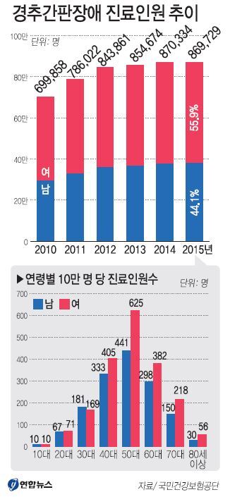 19일 국민건강보험공단의 건강보험진료비 지급자료 분석 결과에 따르면 흔히 목디스크로 불리는 ‘경추간판장애’(질병코드 M50) 진료 인원은 2010년 69만9858명에서 2015년 86만8729명으로 24.3% 증가했다. 그 사이 총진료비는 1666억원에서 2260억원으로 35.6% 뛰었다.
