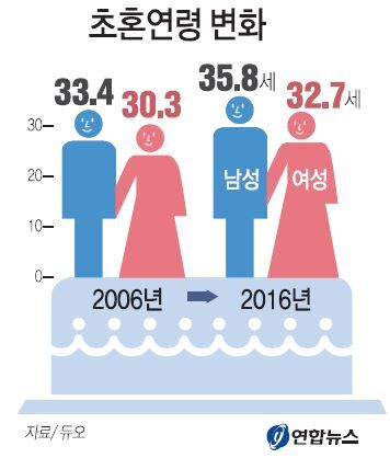 보고서에 따르면 이들 부부의 평균 초혼 연령은 남성이 35.8세, 여성이 32.7세로 10년 전(2006년 남 33.4세, 여 30.3세)보다 남녀 각각 2.4세 높아졌다.