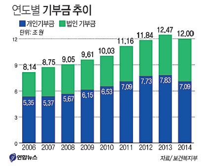 22일 보건복지부의 ‘나눔 관련 통계 자료’를 보면, 2014년 국세청에 들어온 기부금 신고총액은 12조원으로 2013년 12조4700억원보다 후퇴했다. 기부금 총액이 줄어든 것은 조사를 시작한 2006년 이후 처음이다. 지금껏 기부금 총액은 2006년 8조1400억원에서 2007년 8조7500억원, 2008년9조500억원, 2009년 9조6100억원, 2010년 10조300억원, 2011년 11조1600억원, 2012년 11조8400억원 등으로 매년 증가했었다. 연합뉴스