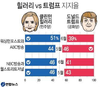 26일(현지시간) 워싱턴포스트(WP)와 ABC방송이 지난 20~23일 미전역에 걸쳐 등록유권자 835명을 대상으로 실시한 공동 여론조사 결과를 보면, 클린턴은 51%를 얻어, 39%에 그친 트럼프를 12%포인트 차로 앞질렀다. 이는 오차범위(±4%포인트)를 벗어난 것이다. 연합뉴스