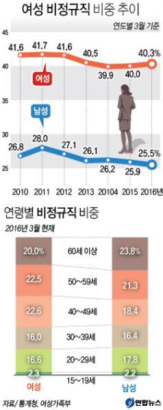 올해 3월 기준으로 여성 임금근로자는 842만3000명이며, 이 중 비정규직 근로자는 40.3%(339만5000명)를 차지해 작년 동기(40.0%)에 비해 0.3%포인트 늘었다. 이는 남성 임금근로자의 비정규직 비율(25.5%)보다 훨씬 높다.