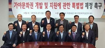 ▲ 지난달 27일 국회 의원회관에서 열린 가야문화권 지역 발전을 위한 포럼 참석자들이 가야문화권 개발 및 지원에 관한 특별법 제정을 촉구하며 기념 촬영을 하고 있다.