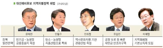 국민의당 안철수 전 대표는 “농생명식품산업 분야에 특화된 금융을 발전시키면 지역에서 단기적으로 효과를 볼 수 있다”고 했다. 이어 “메가탄소밸리 구축으로 탄소산업의 주도권을 확보하고, 익산식품클러스터 사업에 4차 산업혁명 신기술 도입을 통해 부가가치를 창출 할 수 있을 것”이라고 강조했다.안희정 충남지사(민주당)는 “역사문화자원은 자그마한 농공단지를 유치하는 것 이상의 지역발전 동력이 된다”며 “문화재 발굴이나 복원에 대한 재정 집중 투자로 지역 관광산업을 육성할 수 있는 근거를 만들겠다”고 했다. 아울러 광역경제권을 설정해 자치권과 기획권 등 권역 재조정 사업을 진행해야 한다고 말했다.