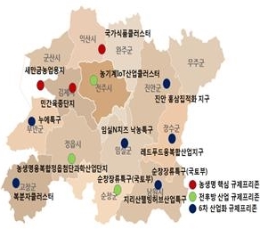 농생명 산업기반이 집적된 규제프리존 단지는 국가식품클러스터, 새만금농업용지, 민간육종단지, 순창장류특구, 농기계 IOT산업클러스터, 농생명육복합정읍첨단과학연구단지, 남원 지리산웰빙허브사업특구, 진안 홍삼집적화지구, 장수 레드푸드 융복합지구, 임실N치즈 낙농특구, 고창 복분자클러스터, 부안 누에특구로 총 12곳이다.