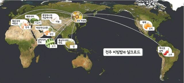 한국을 넘어 세계인의 입맛을 사로잡고 있는 전주비빔밥은 실크로드 문명 교류를 통해 탄생한 다문화 음식이다. 전주비빔밥의 주재료인 쌀, 마늘, 당근, 오이, 시금치, 고추 등은 모두 실크로드를 통해 전래된 식재료들이다.
