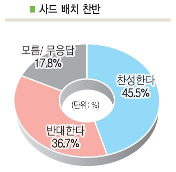 조사 결과 전체 응답자의 45.5%가 사드 배치에 찬성하는 것으로 나타났으며, 반대는 36.7%로 조사됐다.