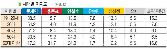 안 후보는 50대와 60대에서 20% 이상의 지지를 받았고, 홍 후보는 60대 이상(31.7%)에서만 20% 이상 지지를 받았다.