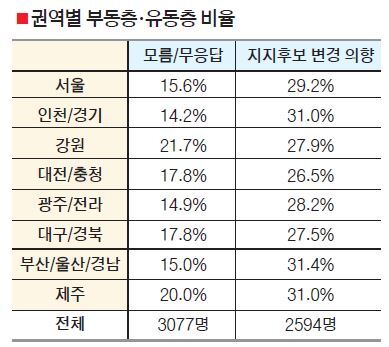 부동층 비율은 강원(21.7%), 제주(20%), 대구·경북(17.8%), 대전·충청(17.8%)이 상대적으로 높았고, 유동층은 권력별 기준으로 부산·울산·경남(31.4%)과 인천·경기(31.0%), 제주(31.0%)가 상대적으로 높았다.