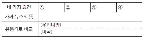 △ 〈읽기자료1〉을 읽고 가짜 뉴스의 요소, 개념 및 유통 경로에 대해 아래 표 안에 정리해 보시오.