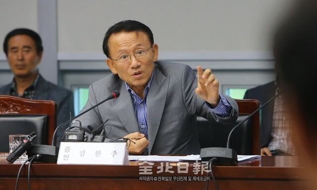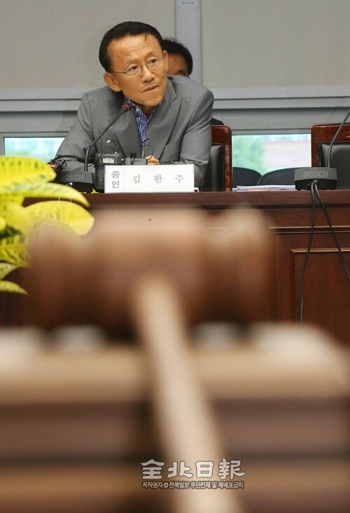 ▲ 22일 도의회에서 열린 삼성그룹의 새만금투자 협약 조사특별위원회에 김완주 전 도지사가 증인으로 출석한 가운데 조사특위 위원들의 질문에 답을 하고 있다. 박형민 기자