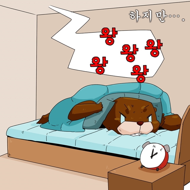 (아파트 위층에서 개가 짖고 있고 잠을 청하던 수달은 귀를 막고 괴로워하고 있다. 시계는 새벽 2시를 가리키고 있다.)