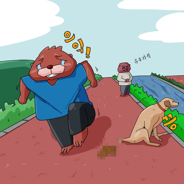 (천변에서 조깅하던 수달이 개의 배설물을 보고 기겁을 하는 모습, 개와 견주는 유유히 천변을 산책 중)