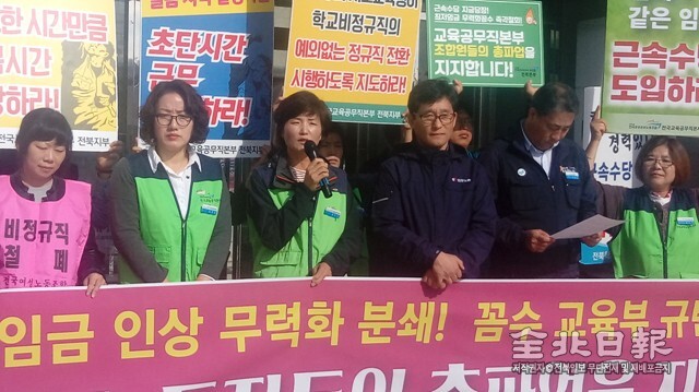 민주노총 전북본부와 전북 학교비정규직연대회의는 19일 전북교육청 앞에서 기자회견을 열고 “교육당국이 최저임금 무력화를 위해 꼼수를 부리고 있다”며 “학교비정규직 노조의 승리를 위해 연대하겠다”고 밝혔다.
