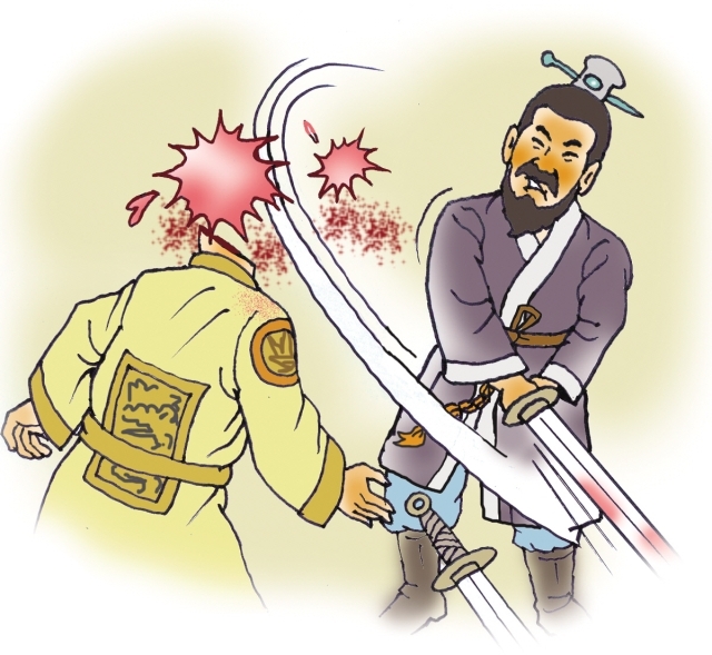 연개소문이 소리치자 영류왕이 칼을 집어 들었다.