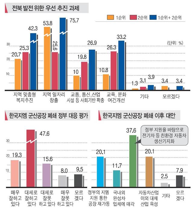 도민들은 ‘한국지엠 군산공장이 폐쇄된다면 가장 바람직한 대안은 무엇이라고 생각하느냐’는 질문에 37.6%가 ‘정부 지원을 바탕으로 전기차 등 친환경 자동차 생산기지화’라고 응답했다. 다음으로 ‘자동차산업 이외 대체산업 육성’(20.1%)과 ‘정부의 GM 지원을 통한 군산공장 재가동’(20.1%)을 꼽았으며, 응답자의 11.7%는 ‘국내외 완성차 업체에 매각’을 들었다. 전북도가 군산경제를 회생시킬 대책으로 정부 지원을 전제로 한 ‘전기상용차 중심의 자율주행 글로벌 전진기지’ 육성을 내세운 부분이 도민들의 인식에 영향을 끼친 것으로 분석된다. 이와 관련, 현 정부에 대한 높은 신뢰가 작용했다는 분석도 나온다.