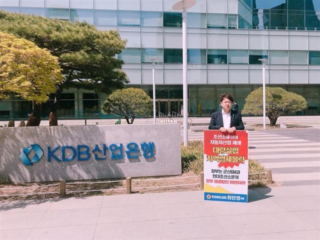 최인정(군산3선거구) 도의원은 지난 12일 산업은행 본사 앞에서 1인 시위를 하며, “산업은행이 한국지엠 군산공장 폐쇄를 막아달라”고 촉구했다.