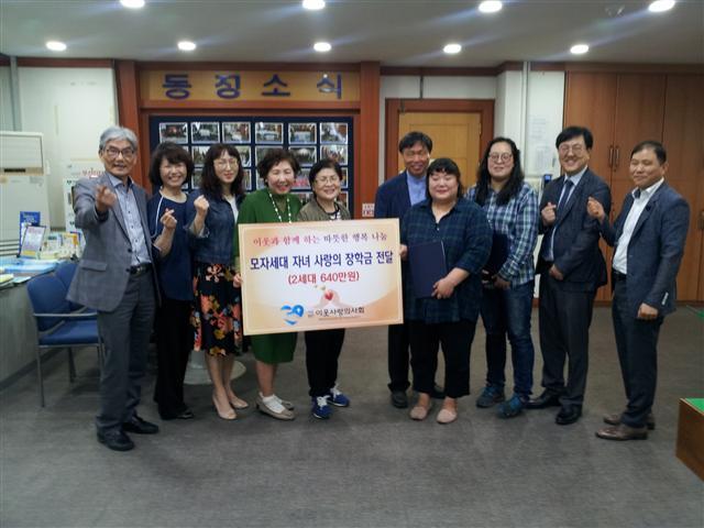 (사)이웃사랑의사회(이사장 김임, 회장 이상권)는 21일 전주시 완산구 중앙동 주민센터에서 관내 모자세대 자녀 2명에게 장학금 640만원을 전달했다.