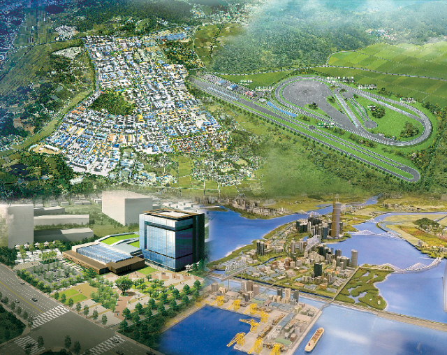 ▲ 익산 국가식품클러스터·상용차부품 주행시험장·새만금 신항만·전북혁신도시 금융센터 조감도. 왼쪽 위부터 시계방향.