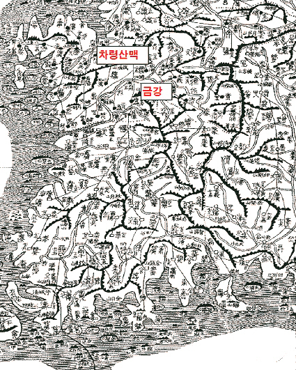 ▲ 대동여지전도에 나타난 차현(차령)산맥과 금강(공주강)물줄기.
