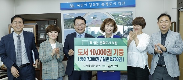 익산 엄마들의 모임인 (사)꽃피는 문명(대표 김민정)은 지난 17일 정헌율 익산시장을 방문해 독서문화 활성화와 건전한 나눔문화 창출을 위해 써 달라며 영어원서 7300권과 일반도서 2700권 등 모두 1만권의 도서를 쾌척했다.