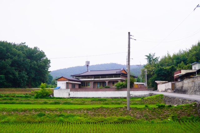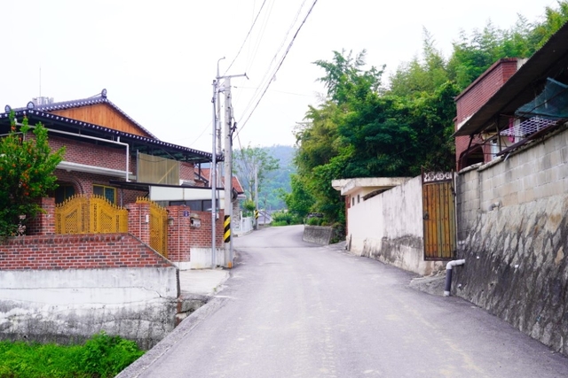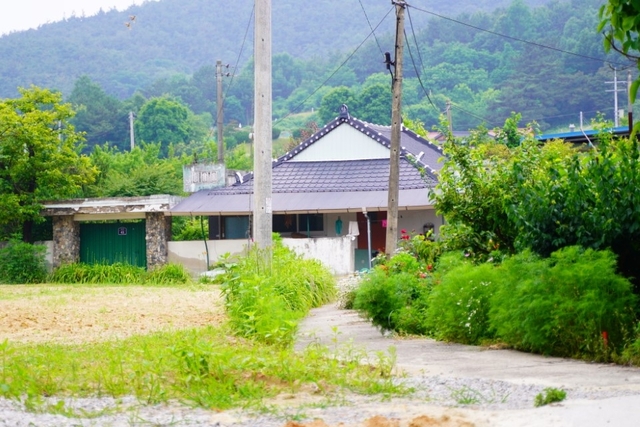 마을 어귀에 들어서자 작은 논과 밭이 펼쳐집니다. 마을로 들어가는 길은 위의 사진에서 보는 오른쪽 길로 들어가야 합니다. 들어서자마자 보이는 전원주택과 여름의 색을 입은 밭이 시야를 감싸는데 신선한 공기와 함께 보기만 해도 힐링이 됩니다.