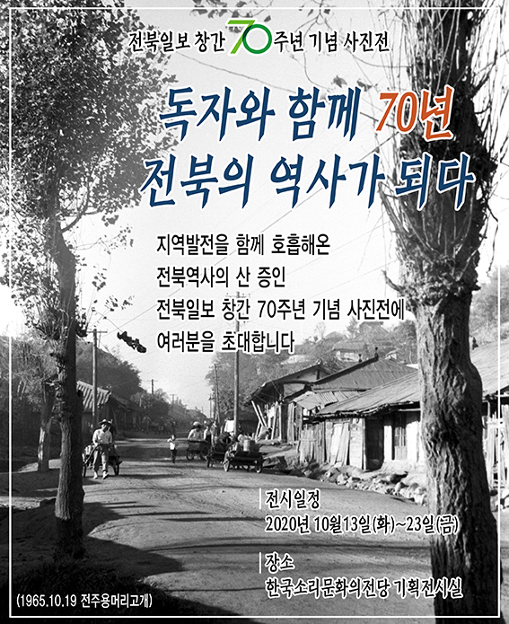 올해로 창간 70주년을 맞는 전북일보(회장 서창훈·사장 윤석정)는 오는 13일부터 23일까지 열흘간 전주 한국소리문화의전당 기획전시실에서 ‘창간 70주년 기념 기획전시’를 개최한다.