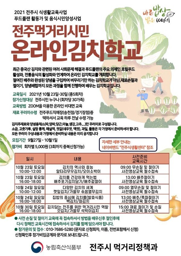 전주시 농업기술센터는 오는 23일부터 30일까지 5차례에 걸쳐 ‘전주 먹거리 시민 김치학교’를 비대면으로 운영한다고 28일 밝혔다.