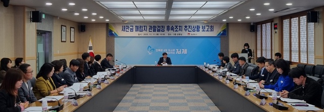 김제시는 11일 시청 2층 상황실에서 김희옥 부시장 주재로 관련 실‧과‧소 담당들이 참석한 가운데 ‘새만금 매립지 관할결정 후속조치 추진상황 보고회’를 열고, 새만금 관할권 확보 이후 부서별 후속 행정절차 이행 상황을 점검하며 실효적 관할권 확립을 위한 대응전략을 논의했다.