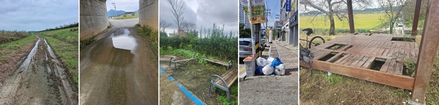 금강 자전거길은 쉼터 파손 등 시설물 보수, 성당포구 일대 스탬프·공기주입기 고장 수리, 상습 침수구역 구조적 개선 또는 진입 제한 표지 설치가 필요한 것으로 조사됐다.