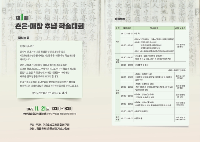 (사)호남고전문화연구원은 촌은 유희경과 매창 이향금의 삶과 사랑, 문학세계를 조명하는 ‘제1회 촌은‧매창 추념 학술대회’를 21일 오후 1시부터 부안예술회관 회의실에서 개최한다.