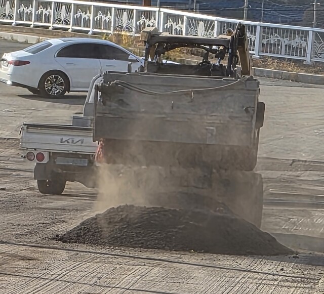 18일 장수군 장계면 시가지에서 LPG 배관망 공사 과정 중 배관 매설 후 도로 복구를 위해 절삭된 아스콘을 운반하는 작업이 진행되면서 비산먼지가 발생하고 있다.                    /사진=이재진 기자