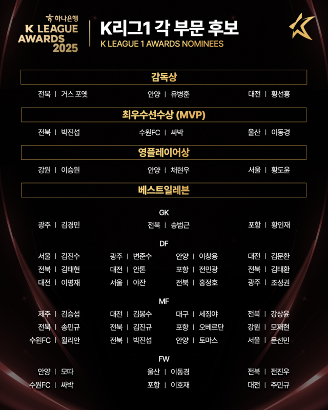 K리그1·2 베스트일레븐은 시상식 당일 오전에 사전 공개할 예정이다. MVP·영플레이어상·감독상 수상자는 같은 날 오후 3시 서울 홍은동 스위스그랜드호텔에서 열리는 하나은행 K리그 2025 대상 시상식 현장에서 발표된다.