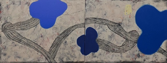 푸른빛을 띠는 형체 모를 무언가가 시선을 사로잡는다. 구름을 닮은 것 같기도 하고, 꽃이 연상되기도 한다. 모노톤의 배경이 포근한 인상을 준다. 그런데 그저 평범한 추상화인 줄 알았던 화면을 자세히 들여다보면 연필로 가늘게 그어진 선부터 점선, 파스텔을 무작위적으로 드로잉한 흔적까지 곳곳에서 발견할 수 있다. 이것은 현실일까, 혹은 의식과 무의식의 모호한 경계일까. 고요히 멈춘 동상면의 풍경 속 사라진 기억의 흔적은 아닐까.