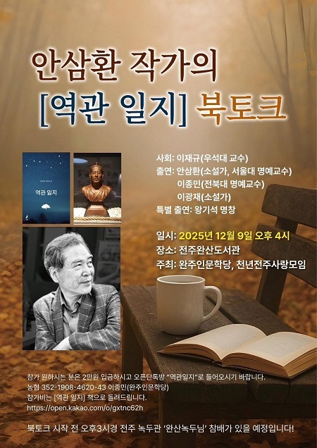 완주인문학당과 천년전주사랑모임에서 마련한 이번 북토크에는 이종민 전북대 명예교수와 이광재 소설가가 참석하며 특별 게스트로 왕기석 명창이 자리해 ‘천명’ 중 한 대목을 축가로 부를 예정이다. 사회는 이재규 우석대 교수가 맡는다.