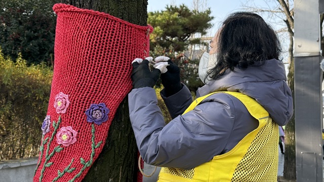 전주시자원봉사센터 ‘나무야, 안아 줄게!’ 트리허그 사업 한옥마을 태조로서 진행 한땀 한땀 작업한 뜨개 옷 입혀⋯알록달록 구경하는 시민들도 “너무 예뻐요” 박수